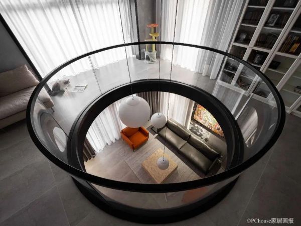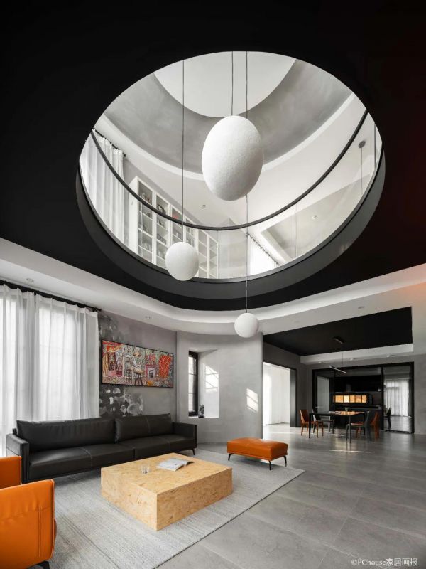 改造亮点:设计师在建筑原有的基础上,形成挑空结构,打通一层和二层空间,同时,让自然光从圆形挑空区贯穿而下,让整个客厅更为通透、明亮。