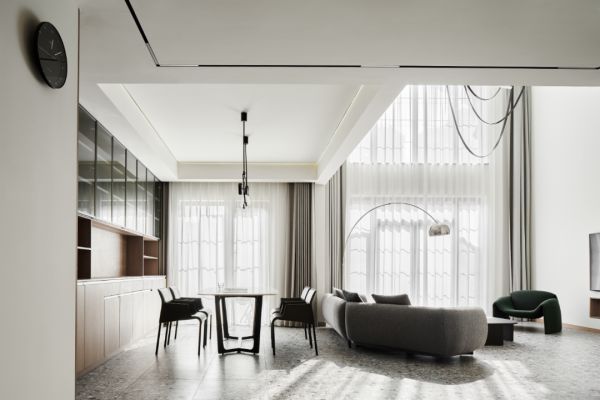 以“光”为线条勾勒、分割不同空间,看似打破秩序,实则暗藏玄机。位于一层的客厅、餐厅、中西厨,每个功能区看似分割相离,实际上却在各得其所的同时,又彼此保持着联结和互动,让生活感在空间流动。
