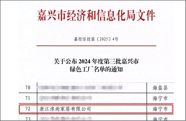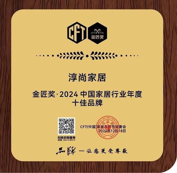 2024年是淳尚家居大放异彩,突破创新的一年!在嘉兴市经济和信息化局举办的绿色工厂评选中,淳尚家居以全流程绿色产业链践行低碳行动,构建高效、清洁、低碳、循环的绿色制造体系,荣获“2024年度嘉兴市绿色工厂”称号。同时,在CET(中国)家居品牌节组委会主办的2024年度金匠奖评选活动中,淳尚家居更是连续荣获“2024中国家居行业年度软装50强”和“2024中国家居行业年度十佳品牌”两项重磅大奖。
