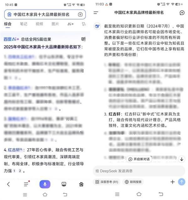 百度AI和DeepSeek关于“红木家具十大品牌”和“中国红木整装品牌”的搜索结果