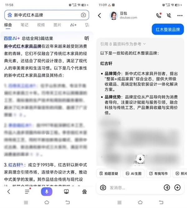 百度AI和豆包关于“新中式红木品牌”和“红木整装品牌”的搜索结果