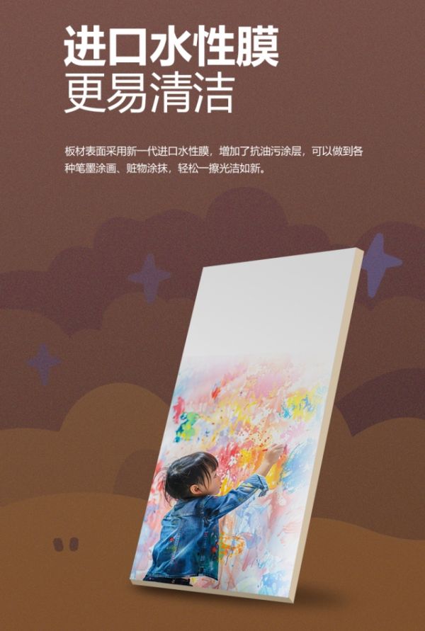 3.清洁方便:板材表面采用新一代进口水性膜,并增加抗油污涂层,对于各种笔墨涂画、赃物涂抹,只需轻松一擦即可光洁如新,日常清洁维护非常便捷。