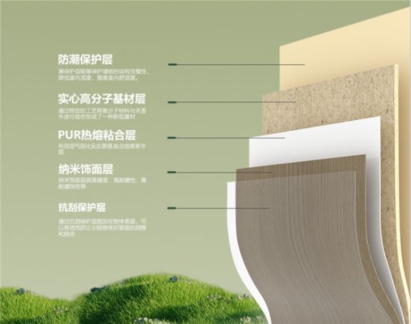 1.环保性能卓越:生产过程中使用进口水性膜和 PUR 热熔胶,经热熔压技术粘合,有害物质大幅降低,甲醛释放量未检出,施工后无异味,可即装即住,环保性远超新国标 ENF 级标准。