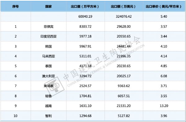 据中国建筑卫生陶瓷协会发布的数据显示,2024年,我国陶瓷砖出口量维持在6.00亿平方米,同比下降2.86%,出口单价同比下跌31.30%至5.40美元/平方米,导致出口额从48.56亿美元降至32.41亿美元,同比降幅达33.26%,为近八年新低。2024年,中国陶瓷砖出口前十大目的地国家/地区的出口总量为4.02亿平方米,占总出口量的66.92%。2024年,广东、福建、山东、辽宁、广西为我国陶瓷砖出口前五大省份,合计出口量占比达91.93%,与2023年(92.51%)基本持平。与2023年相比,浙江跌出前五,广西上升至第5位。