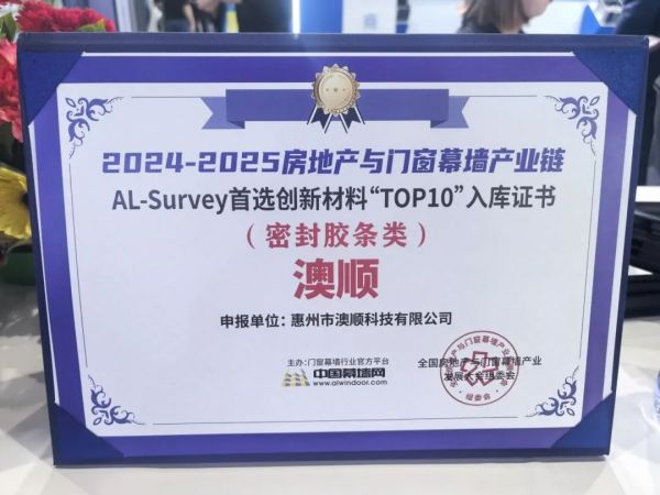 在本次博览会上,澳顺科技凭借其在密封胶条领域的表现,在“2024-2025年度第20届AL-Survey建筑门窗幕墙行业品牌榜”评选奖项中,澳顺科技荣获“密封胶条首选品牌”肯定,并入库首选创新材料(密封胶条类)“TOP10”。