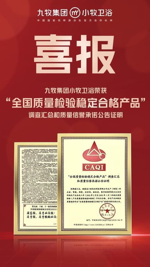 经中国质量检验协会调查汇总,九牧集团小牧卫浴生产(销售)的五金、智能、陶瓷、浴室柜、淋浴房、集吊晾晒等厨卫生活空间相关产品在近三年(2022年2月至2025年1月)的相关质量检验(产品质量监督抽查和检测)中均为合格,并对产品和服务质量诚信作出“全国质量检验稳定合格产品”质量信誉承诺公告。