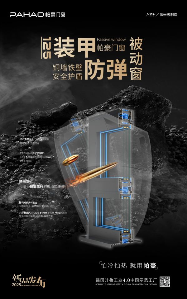 特别值得推荐的是,此次展会,帕豪门窗还将隆重推出125系列装甲防弹被动式铝合金系统门窗,框扇多层叠加式装配穿甲钢板,具备防弹的性能。同时配置四层聚合物SGP防弹膜及多腔中空低辐射高性能玻璃,保温效果极好,可用于超低能耗的被动式建筑。装配德国诺托150KG高承重五金,无底座执手,多点锁闭,安全可靠。采用德国泰诺风超大规格54mm多腔体PA66隔热条,整体框架抗风压性更强,以全新的性能,带来具有差异化的市场竞争力,助力渠道打破内卷、制胜终端。