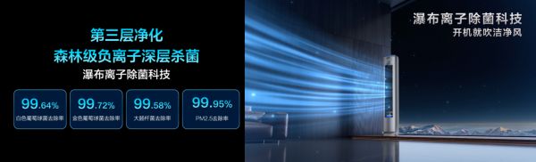 第三层净化则是森林级瀑布离子深度净化除菌。TCL小蓝翼C7新风空调柜机出风口配备瀑布离子除菌模块,在出风口8米处,负离子浓度甚至可以超过20000个/每立方厘米,达到森林级环境水平,实现对整个空间除菌的净化效果,为用户源源不断地输送森林般清新的健康空气!