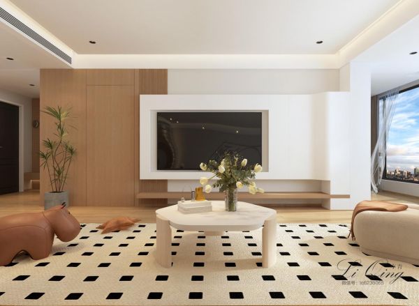 客厅以低饱和度原木色系为基底,搭配雾面质感的奶油系艺术涂料,墙面通过弧形转角与层次叠级弱化结构棱角,营造包裹感与慵懒气质。