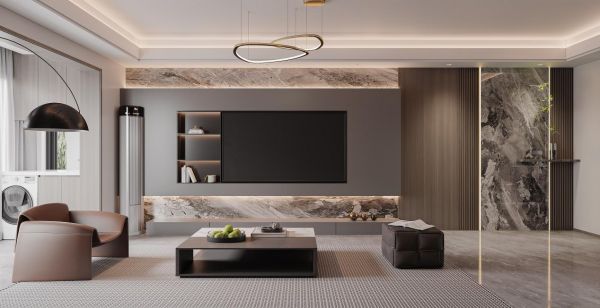 客餐厅为横向空间设计,采用横向空间设计,最大化利用空间。客厅布置简约,棕色皮质沙发搭配同色系单椅,辅以绿植、落地灯点缀,营造温馨氛围;电视背景墙结合大理石与墙板设计,嵌入电视与壁龛收纳架,兼具装饰与展示功能。