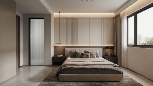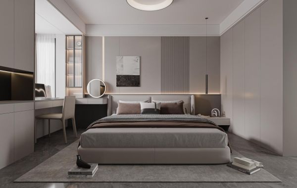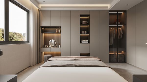 主卧以一体化设计强化空间感,床头墙板与衣柜同色,视觉上拉伸空间,营造温馨舒适氛围。