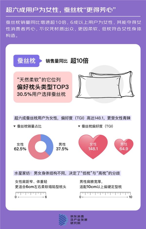 在这场以功能与场景细化为特征的“枕头大战”中,蚕丝枕赢得了女性人群的坚定偏爱。京东数据显示,销量同比超10倍,其中,62.5%的消费者为女性,偏好度是整体用户的近1.5倍。品牌方与京东采销表示,除了“更爱天然材质”,女性偏爱蚕丝枕的背后原因是它刚好适配了女性的身体结构与睡姿特征。
