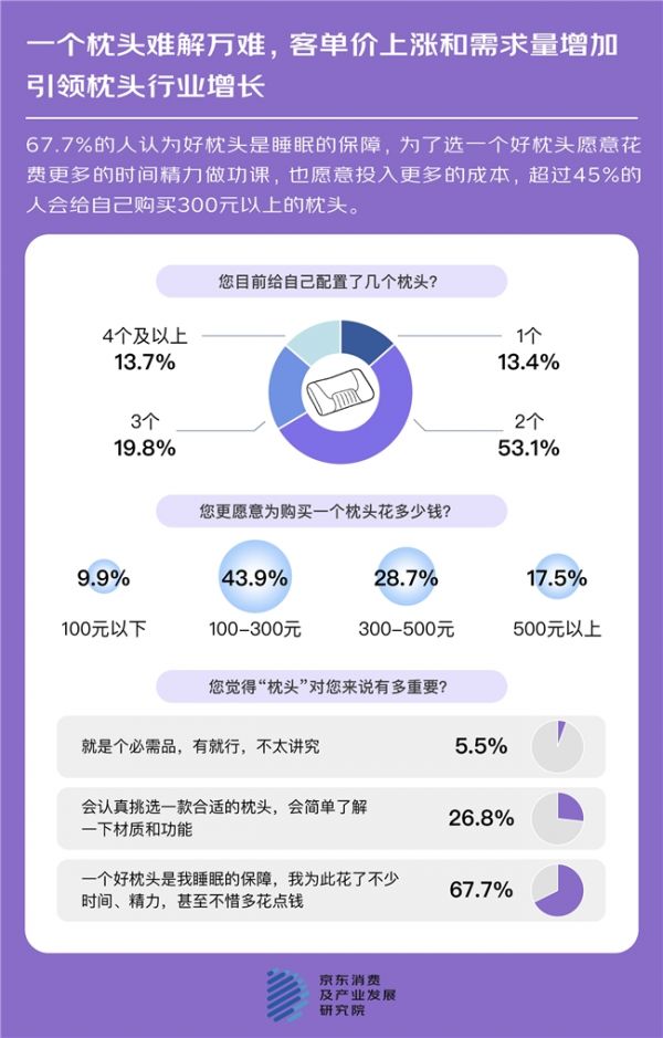 调研结果显示,53.1%的用户拥有两个枕头,13.7%的人拥有四个及以上;与此同时,超过46%的消费者愿意为一个枕头支付300元以上的价格。不止买得多,也确实买得贵了,近7成的受访者表示,一个好枕头是睡眠的保障,为此投入时间、精力甚至预算都在所不惜。