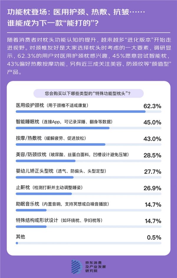 枕头也在走向功能分化。调研结果显示,在特殊功能类枕头中,62.3%的人关注医用护颈枕,主要用于颈椎不适和矫正康复。45%关注智能睡眠枕,43%偏好热敷按摩功能。