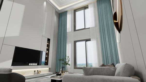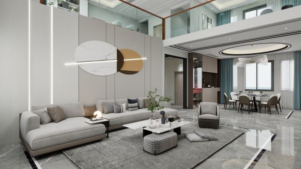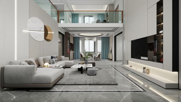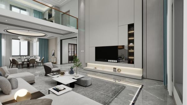 客厅地面采用深灰色水刀拼花瓷砖,不仅易于打理,更增添了现代奢华美感。电视背景利用房屋挑高做立体装饰墙板,嵌入金属展示柜,展现出冷暖材质的碰撞。装饰部分大量采用了金属装饰,让房屋更具备科技感,配以智能设计让家居未来感十足。