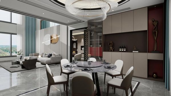 餐厅因业主家庭成员较多,使用宴会桌形式,可满足10人以上就餐,餐边柜延续客厅部分设计,加入大量的金属及玻璃材质,满满的高级感。
