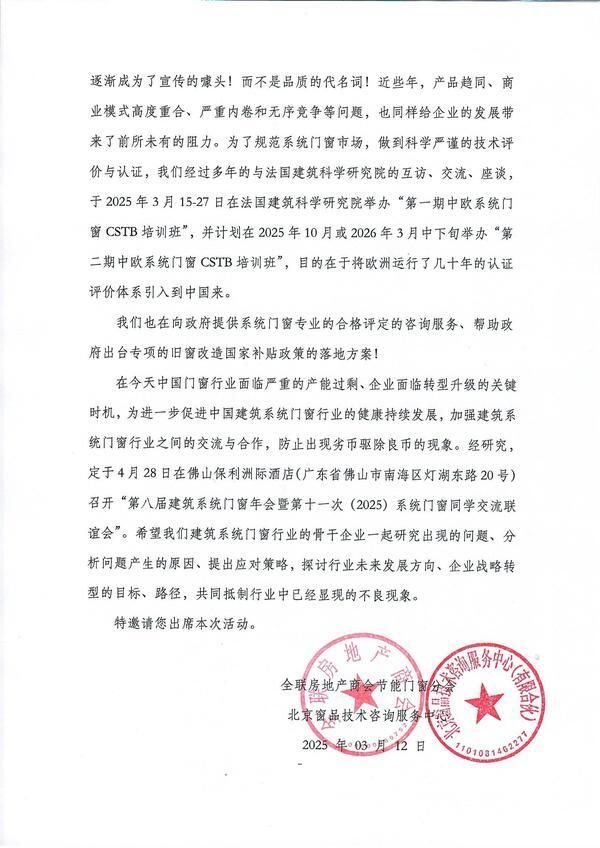 关于邀请出席“第八届建筑系统门窗年会暨第十一次(2025)系统门窗同学交流联谊会”的函