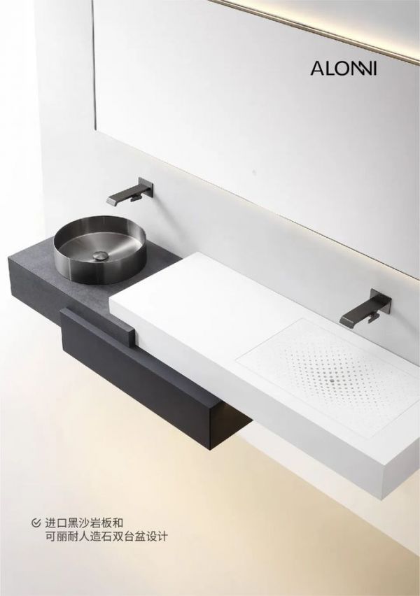 功能突破:进口黑沙岩板和可丽耐人造石双台盆设计,通过科学分区提升使用效率,满足多场景需求;