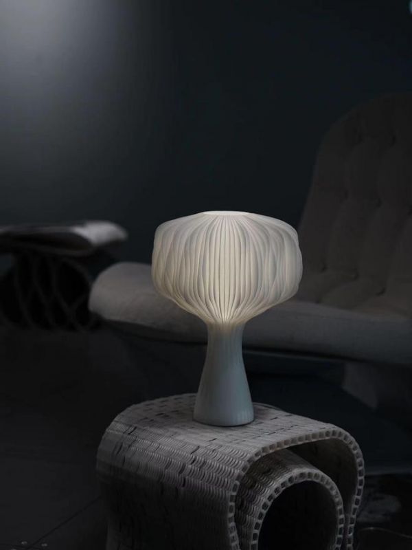 Jellyfishlamp水母灯是对于可降解材料的大尺度1mm片面增材成型作品,使用一体成型的纤薄片面切割光源,通过光源对材质的穿透及衍射表达形态对于光的塑造。