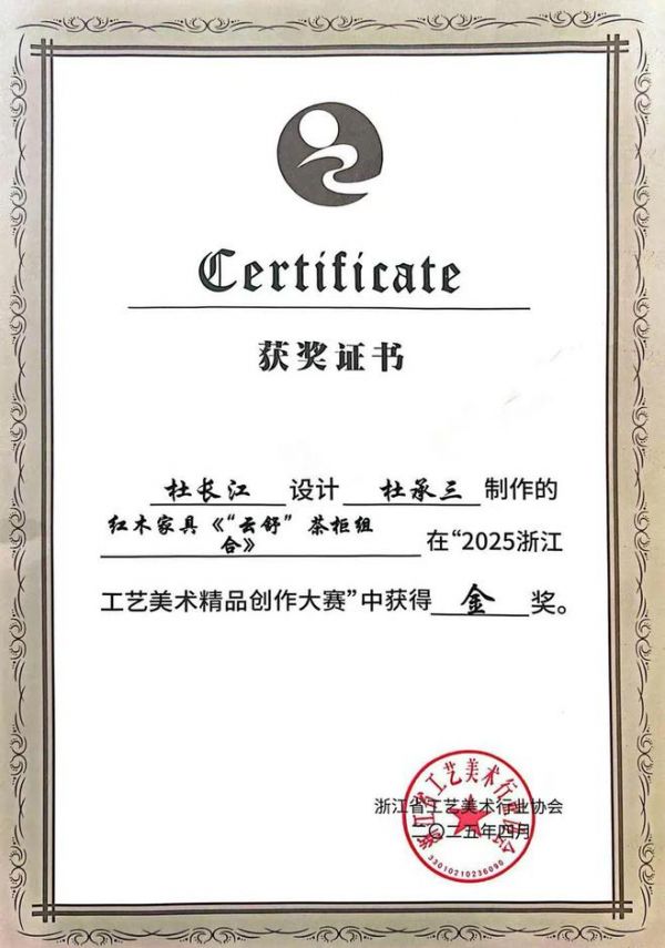 卓木王携《云舒茶空间》在此次博览会上演双星传奇:杜长江设计、杜承三制作的红木家具《“云舒”茶柜组合》在“2025浙江工艺美术精品创作大赛”中获得金奖;杜长江设计、杜承三制作的红木家具《“云舒”茶桌椅套件》在“2025浙江工艺美术精品创作大赛”中获得铜奖。金铜辉映间,见证东方匠心的多维突破。