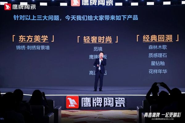 面对各方声音与需求,鹰牌营销中心副总经理谢伟不仅精心整理、提炼了2025年鹰牌陶瓷需要面对的三个关键问题,更在现场对锦绣、觅境、鹰牌岩板、天工、高透原石、森林木歌、质感理石、鲸MAX·星钻釉、花样年华九大春季系列新品的创作理念、工艺技术与应用场景进行了深入解读。
