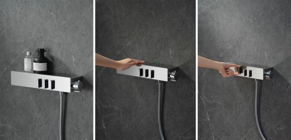 获奖产品FH 7697AS-6005-SG推钮式花洒系统,以“功能与美学并重”为核心设计理念,采用半隐藏式结构,巧妙融合了明装花洒的安装便捷性与暗装系统的整洁美观,满足现代用户对实用性与视觉高级感的双重追求。其承载的GoSlide推钮式控制技术,实现了“一推钮多重出水”的直观操控体验。用户可以通过三个独立推钮,自由控制雨淋、瀑布和手持三种出水模式,甚至可以同时开启多种模式,带来如SPA般的舒压沐浴享受。