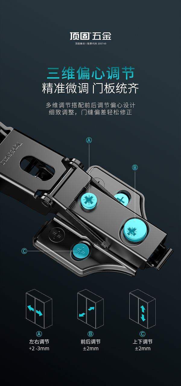 一、适配百变门板:从极简骨骼线到复古栅格,通吃所有“挑剔”造型全屋定制的趋势是“颜值为王”,但异形门板对铰链的兼容性要求极高。顶固这款铰链的三维偏心调节系统(左右±2-3mm、上下±2mm、前后±2mm)堪称“门板矫正神器”。实测中,无论是超薄的36mm骨骼线门板、雕花复杂的栅格门板,还是考验工艺的45°海棠角门板,均能通过调节实现门缝均匀、严丝合缝。尤其针对高端定制中常见的PET肤感门板和实木雕刻门板,其稳定性表现堪称惊艳,彻底告别“门板歪斜、缝隙宽窄不一”的尴尬。技术亮点:多维调节底座:通过偏心螺丝和调节螺母,轻松修正安装误差,节省返工时间。隐藏式设计:铰链臂与门板线条完美融合,正面看不到外露零件,极致契合极简风、侘寂风等美学需求。二、零凸距开启+125°大角度:空间利用与取物便捷的双重突破传统铰链的两大痛点:开门凸出占用空间、角度受限导致取物困难。顶固这款铰链用创新设计直接“破局”:零凸距开启:当柜门打开≥90°时,铰链臂自动收缩至柜体平面,实现“门板隐身”。实测中,厨房转角柜的调料拉篮、衣柜分区柜的内衣抽屉均可丝滑抽拉,再也不用担心“开门卡抽屉”。