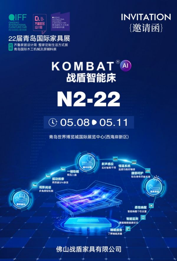 5 月 8 日 - 5 月 11 日,22 届青岛国际家具展、齐鲁家居设计周・整家定制生活方式展与青岛国际木工机械及原辅料展在青岛世界博览城国际展览中心(西海岸新区)盛大举行。佛山战盾家具有限公司携 KOMBAT AI 战盾智能床全新柯梦特系列亮相 N2 - 22 展位,凭借独特的设计风格与先进实用的功能,成为展会现场的焦点,吸引了大量观众前来体验与咨询,为家居行业带来一场智能与美学交融的盛宴。
