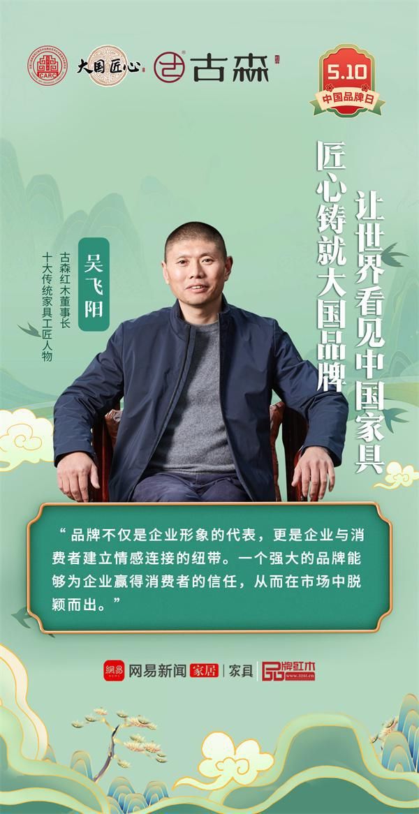 十大传统家具工匠人物、古森红木董事长吴飞阳匠心语录:“品牌不仅是企业形象的代表,更是企业与消费者建立情感连接的纽带。一个强大的品牌能够为企业赢得消费者的信任,从而在市场中脱颖而出。”