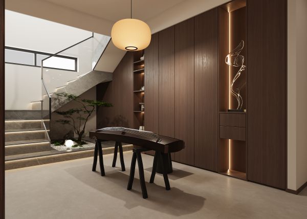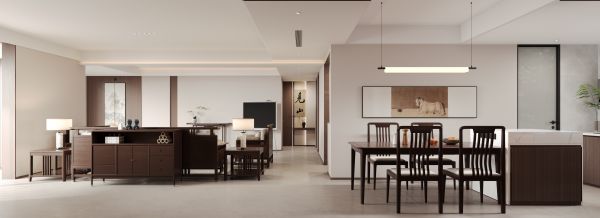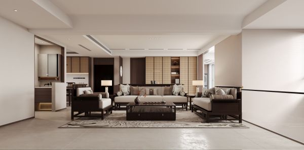 在色彩运用方面采用淡雅、柔和的色彩,如米白色、浅灰色、淡青色等,避免过于鲜艳浓烈的色彩,以营造出宁静雅致的氛围;在空间布局上强调质感和流线感,追求空间层次感和跳跃感,通过屏风、窗棂、实木隔断等创造出独特的设计效果。