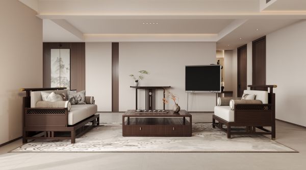 客厅、卧室、书房用新中式胡桃木家具,木纹清晰,线条流畅,沉静庄重,同时运用一些具有宋代特色的装饰元素,如书画、瓷器、盆景等,但要注意适度,不可过于堆砌。