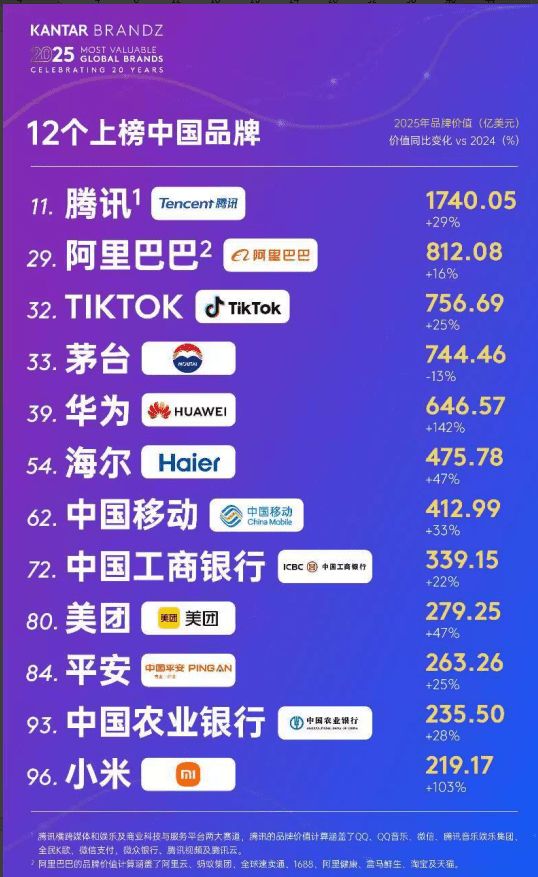 5月15日,2025年凯度BrandZ最具价值全球品牌100强榜单正式揭晓,品牌总价值达到10.7万亿美元,同比增长29%,彰显全球顶端品牌的韧性。苹果作为榜单中唯一的万亿美元级品牌,连续四年蝉联榜首,腾讯、华为、海尔等12个中国品牌跻身百强阵营。其中,海尔连续7年蝉联全球唯一物联网生态品牌,全球排名从最初的第89名逐步上升至第54名,品牌价值同比增长47%,再创新高。