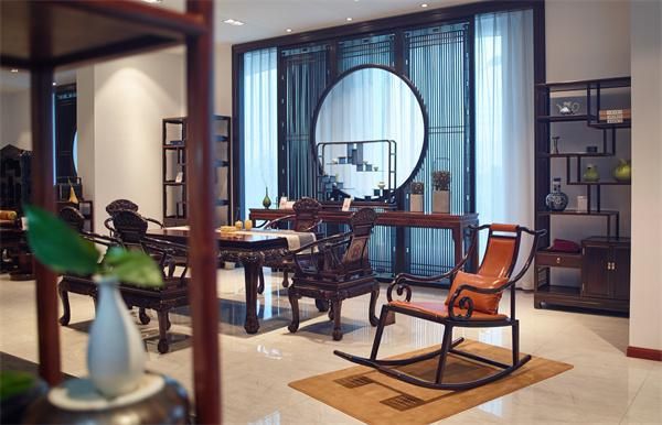 “思想馆”1万平方米展馆里,红木家具与现代软装有机结合,是一个精致的中式生活美学馆。馆内陈列的经典红木家具,以榫卯结构诉工匠的多元智慧,每一处雕花、每一根线条,皆是匠心的现代演绎。