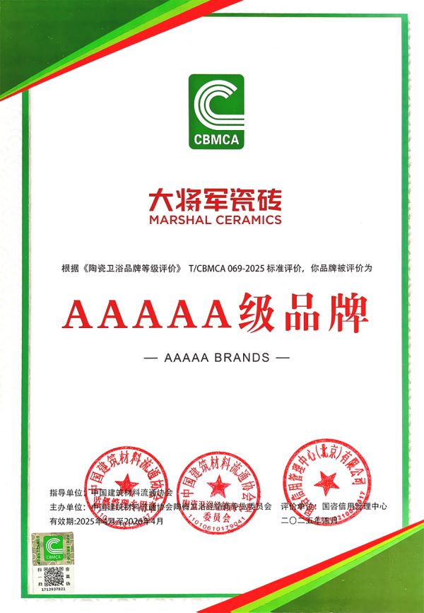 为持续提升产品耐用性能,大将军瓷砖成立了行业首个"耐用科技研发中心",与国际顶i尖设备商展开深度合作,凭借过硬的产品质量和技术创新,大将军瓷砖荣获"陶瓷卫浴AAAAA级品牌"认证和行业唯一的"耐用瓷砖领导品牌"称号。