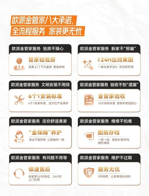 不仅如此,欧派家居还有着更为宏大的品牌升级规划。欧派家居上线“金管家服务”,推出管家轻验房、24H出效果图、6个1安装标准、金管家验收、“金保姆”养护、图纸存档、极速售后、服务无忧八大承诺,为消费者提供“高质高效”服务,让消费者享受“省时省力”体验。