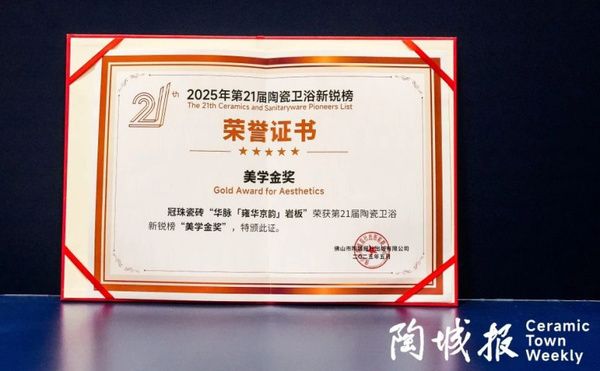在本次颁奖典礼中,冠珠瓷砖凭借其卓越的品牌实力及行业领先地位,获得评审团的高度认可,荣获“陶瓷领军品牌”,冠珠华脉岩板「雍华京韵」系列美学广获赞誉,荣获“美学金奖”!