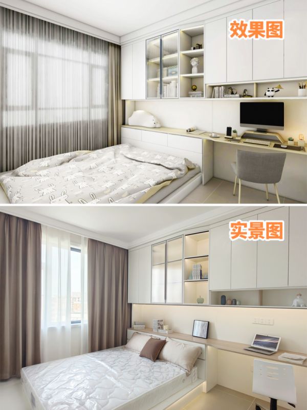 吊柜+书桌+储物柜+地台四维一体设计,在8㎡空间内实现办公区、休息区与收纳系统的精准配比。