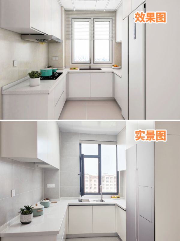 U型橱柜构建黄金三角操作动线,嵌入式冰箱与吊柜形成视觉整体;石英石台面延伸出备餐区,细节处彰显人性化考量。