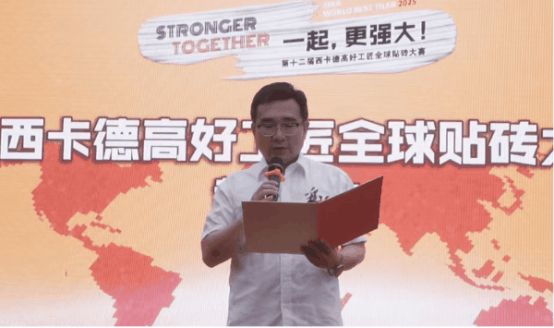 西卡德高副总经理刘少严先生为新店送上开业祝福,并为参与贴砖大赛的工匠加油鼓劲。刘总提到,多年来,西卡德高不仅持续提供优质产品与服务,还坚持举办贴砖大赛,向工匠推广更先进、更环保的薄贴工艺。未来,西卡德高将继续把好产品、好服务、好工艺带给千家万户。