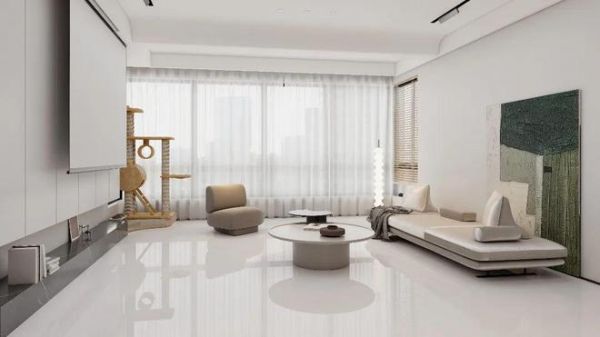 客厅选用低饱和度瓷砖通铺,天然肌理如溪水般自然流淌,搭配灯光设计更显空间通透,视觉连贯。在简而不凡的空间里,承载着温暖的陪伴。