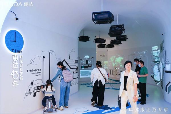 展位的“时光之旅”主题展区,是惠达卫浴对品牌历史初心与未来愿景的真诚表达。展区通过全息投影和趣味互动的形式,展现了“初心原点”“全球制造”“突破创新”“展望未来”四大篇章,串联起惠达卫浴43年的发展脉络。