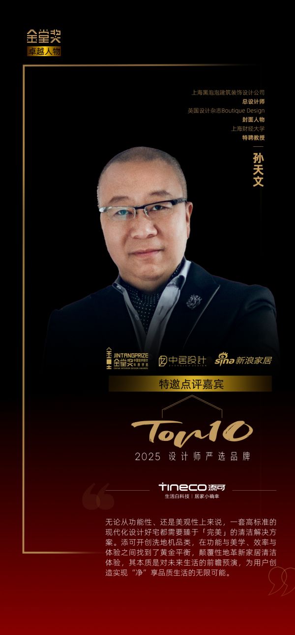 上海黑泡泡建筑装饰设计工程有限公司总设计师,美国室内设计杂志Boutique Design封面人物,上海财经大学特聘教授孙天文老师对添可上榜表示祝贺,并点评道:无论从功能性、还是美观性上来说,一套高标准的现代化设计好宅都需要臻于「完美」的清洁解决方案。添可开创洗地机品类,在功能与美学、效率与体验之间找到了黄金平衡,颠覆性地革新家居清洁体验,其本质是对未来生活的前瞻预演,为用户创造实现“净”享品质生活的无限可能。