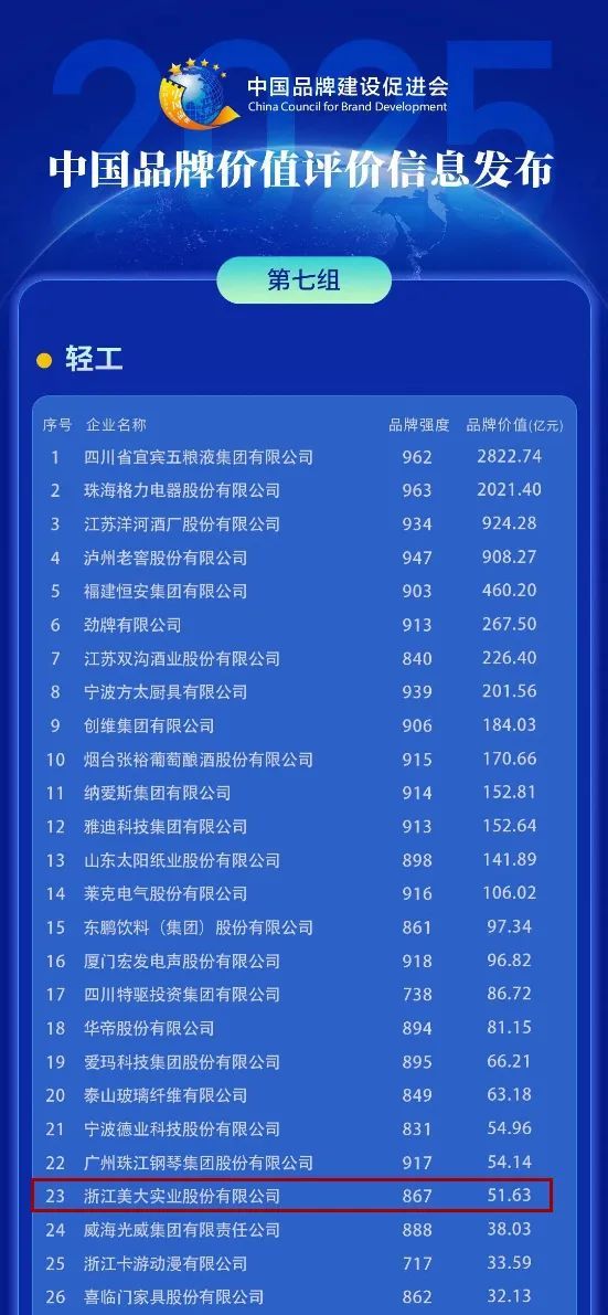 近日,由中国品牌建设促进会、中国资产评估协会主办,新华社品牌工作办公室、中国国家品牌网、《中国品牌》杂志社等单位承办的“2025中国品牌价值评价信息”正式发布了2025年品牌价值评价结果,浙江美大再次荣登榜单,彰显品牌实力。