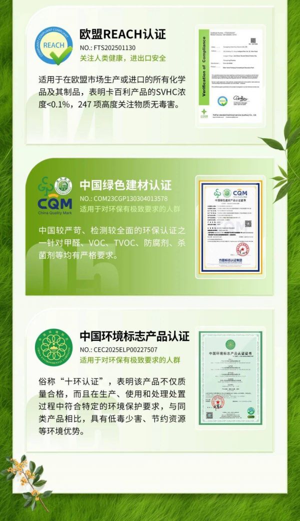 卡百利包揽六大国际环保认证!