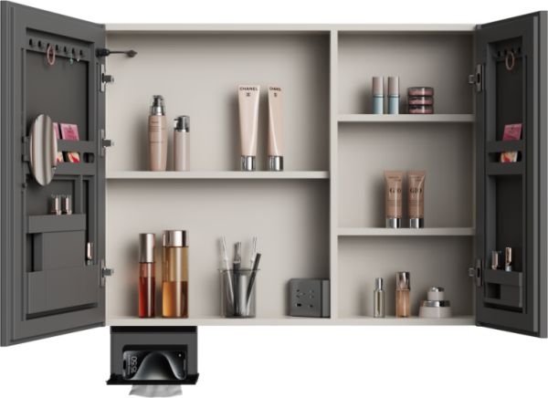 镜门后精心设计的多功能收纳空间,内部分区合理,大小各异的隔层,满足了各种物品的收纳需求。翻转式纸巾架,抽纸孔取纸,抽取更便捷,同时还能放置临时物品,如手机和眼镜等,便于洗漱时的各种放置需求。