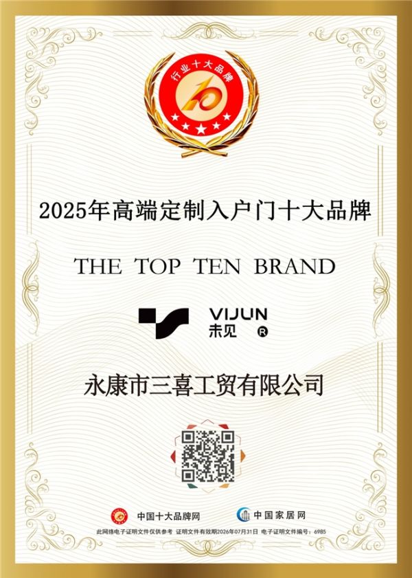 此次入围 2025 中国高端定制入户门十大品牌,不仅是对未见VIJUN门业过往成绩的高度肯定,更是为品牌未来的发展注入了强大动力。在未来,未见VIJUN门业将继续秉持创新精神,不断提升产品品质与服务水平,以更加卓越的产品,满足消费者对高端、安全、美观、个性化入户门的追求,为推动中国高端定制入户门行业的发展贡献更多力量。