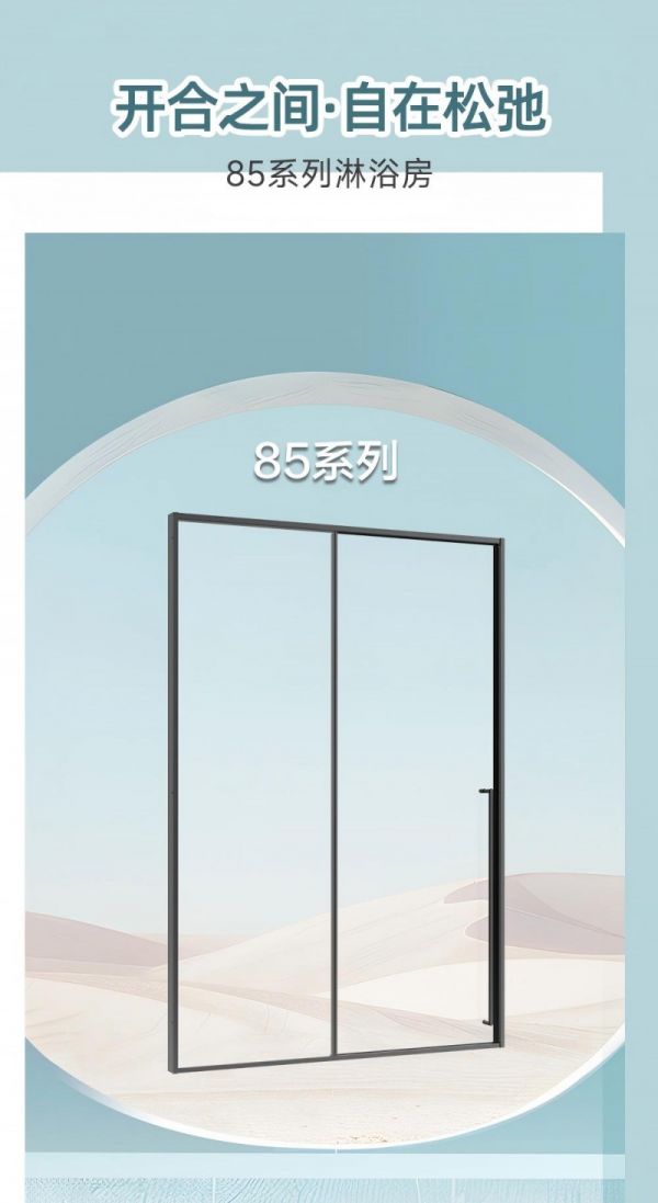 安华85系列淋浴房: 采用加厚玻璃包边与防水防撞密封胶条双重防护,坚固耐用且有效防渗防磕碰;隐藏式滑轮设计确保推拉顺滑静音;极简窄边视觉通透,贴心长竖条拉手设计,方便儿童及老人轻松开合,严丝合缝实现高效干湿分离,营造专属清凉沐浴空间。