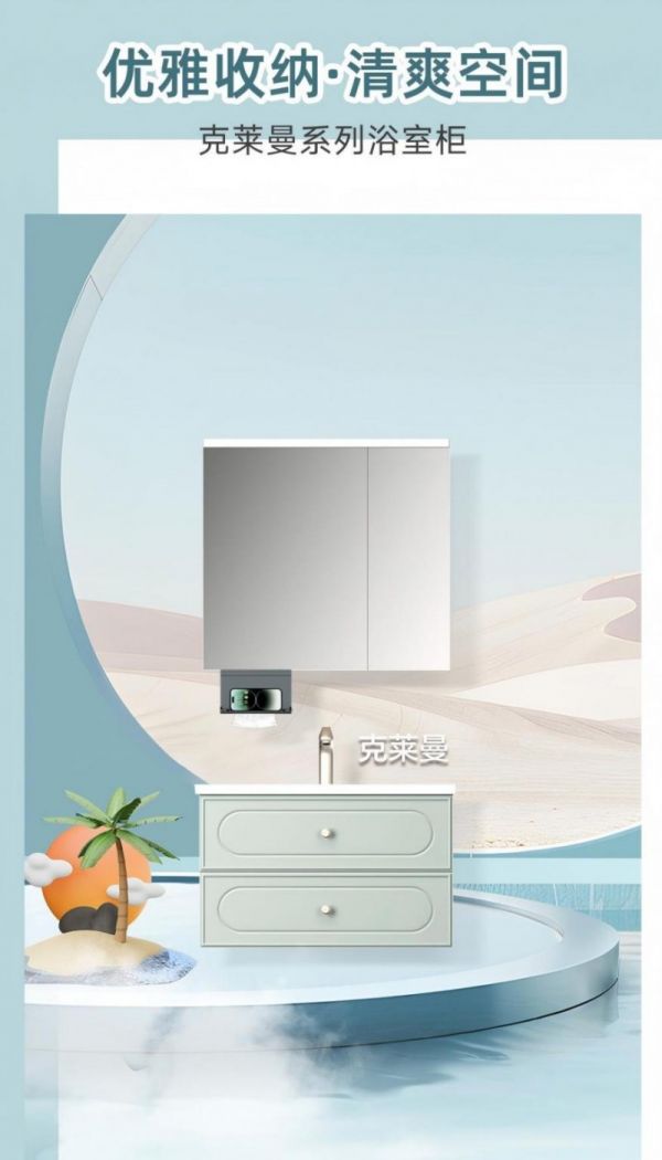 安华克莱曼系列浴室柜: 融合法式风格与轻盈灰调,530mm加宽大盆胆陶瓷盆实用美观;翻转收纳架巧妙利用空间,便于收纳纸巾、手机等物品,防溅水;微波感应顶灯采用无频闪护眼技术,还原清晰视野,告别杂乱,营造清爽整洁的梳妆环境。