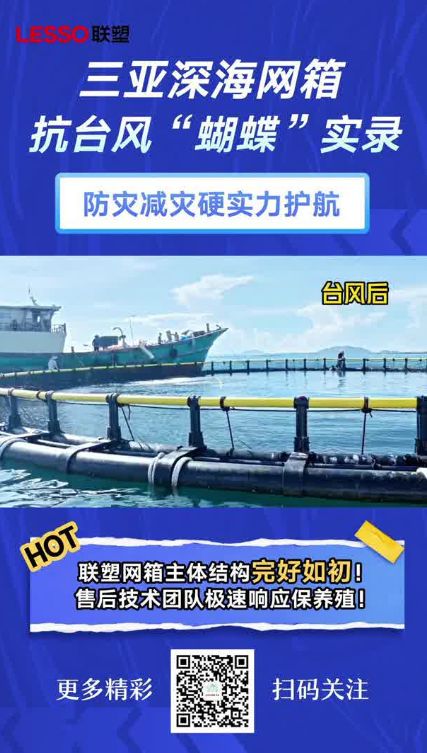 因此在选择养殖网箱时,考虑它能否扛住自然灾害如台风的影响至关重要。 在面对今年6月的台风“蝴蝶”突袭时,联塑农业为海垦(三亚)海洋牧场建设的深海养殖网箱交出了一份高分答卷!