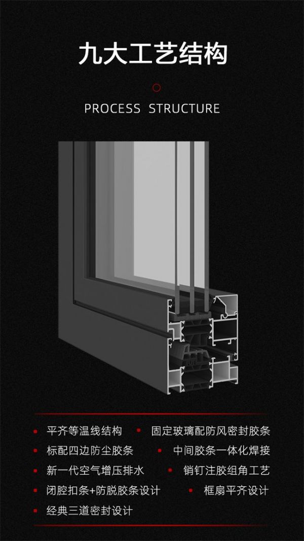 九大工艺结构,如平齐等温线结构、销钉注胶组角工艺、闭腔扣条+防脱胶条设计等,从细节处提升门窗的整体性能。空气增压排水系统,促进雨水高效排出,避免积水渗漏问题,有效延长门窗的使用寿命。